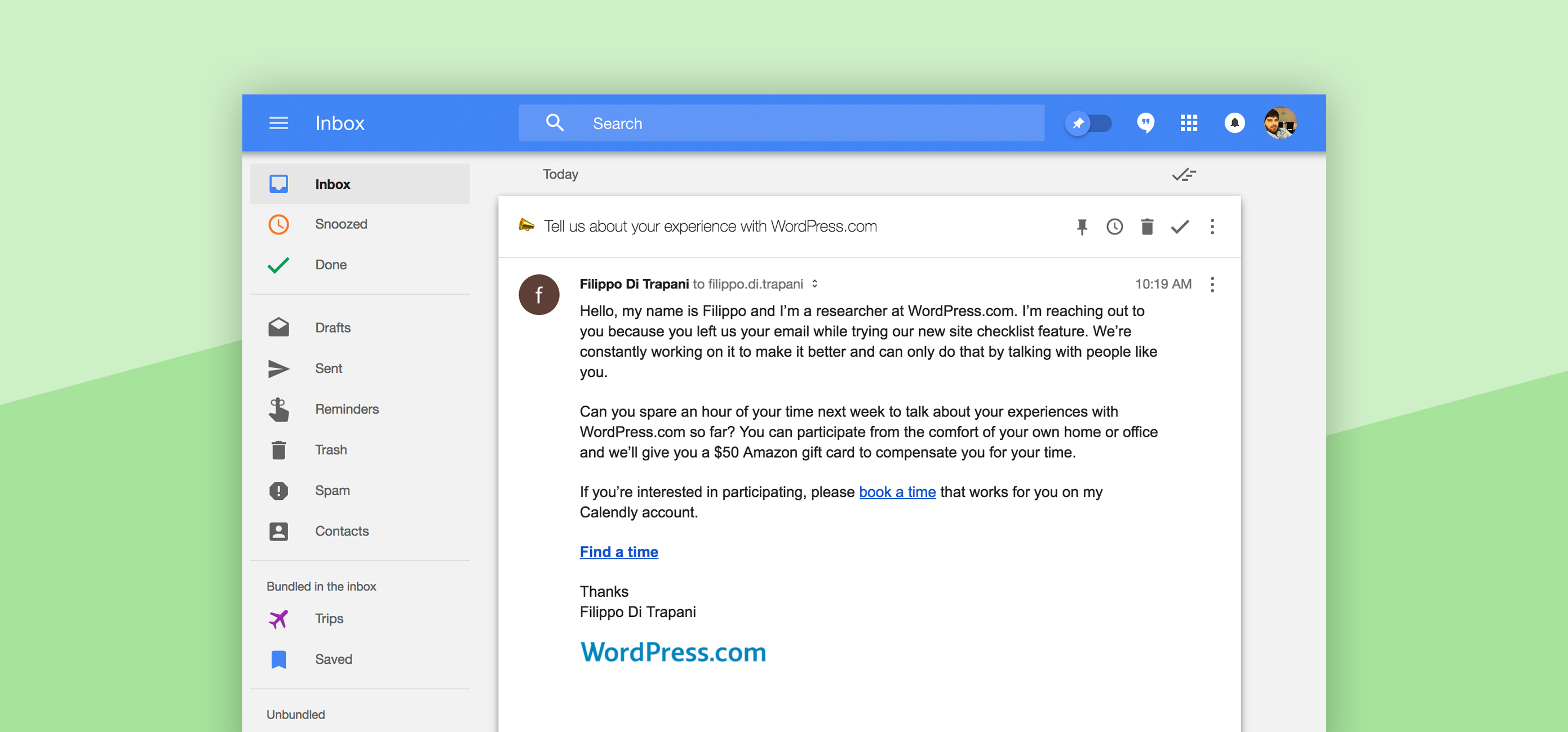 Hello, my name is Filippo and I’m a researcher at WordPress.com. I’m reaching out to you because you left us your email while trying our new site checklist feature. We’re constantly working on it to make it better and can only do that by talking with people like you.
